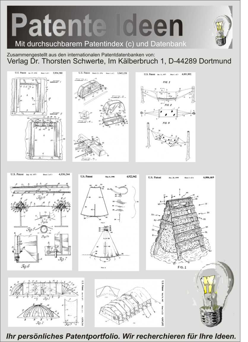 Normalerweise können es sich nur Firmen leisten umfangreiche Patentrecherchen, wie die hier angebotene, erstellen zu lassen. Die Zusammenstellung solcher Sammlungen in gut archivierbarem Format ist aufwendig und setzt kostenpflichtige Datenbankprogramme voraus. Manche amerikanische Firmen berechnen für die Recherche bis zu 3,50 Euro pro Patent! Unser Verlag bietet Ihnen hier diese Leistungen zu einem unschlagbar niedrigen Preis an. Sollte Ihnen ein Sie interessierendes Thema fehlen, so fordern Sie uns und wir erstellen Ihnen ein Angebot, zu dem Sie nicht "Nein" sagen können (allerdings nur für private und nicht kommerzielle Zwecke, für Firmenanfragen existieren andere Bedingungen (Anfragen erwünscht)).